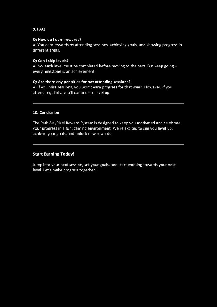 The PathWayPixel rewards system is not just about having fun — it’s about recognizing progress, building confidence, and encouraging further development. By gamifying achievements, we aim to create an engaging, positive, and motivating environment where our clients feel proud of their accomplishments.
